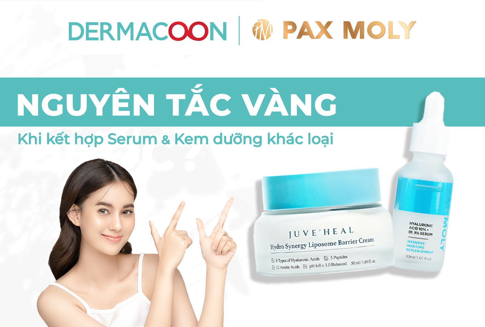 Nên ưu tiên serum cấp ẩm sâu để bổ sung nước cho da ví dụ như Serum PAX MOLY Hyaluronic acid 10% + B5 3%, kết hợp với kem dưỡng có khả năng phục hồi và giữ ẩm tốt như kem dưỡng Juve’Heal Hydro Synergy Liposome Barrier Cream. Cách kết hợp serum và kem dưỡng này giúp da giảm khô căng, mềm mại hơn và duy trì độ ẩm ổn định suốt ngày dài.