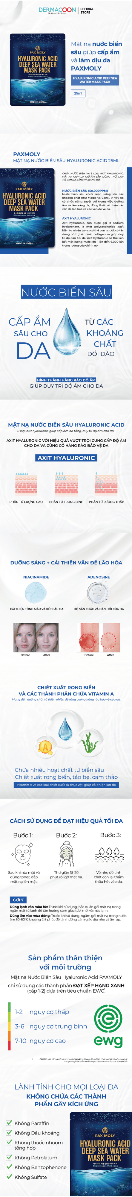 - Mặt nạ Pax Moly Hyaluronic Acid Deep Sea Water Mask Pack là sự lựa chọn cho những ai muốn sở hữu làn da căng mọng, trẻ trung và tràn đầy sức sống. Sản phẩm không chỉ cung cấp độ ẩm sâu mà còn giúp hỗ trợ chống lão hóa, hỗ trợ làm sáng da và bảo vệ da khỏi tác hại của môi trường.