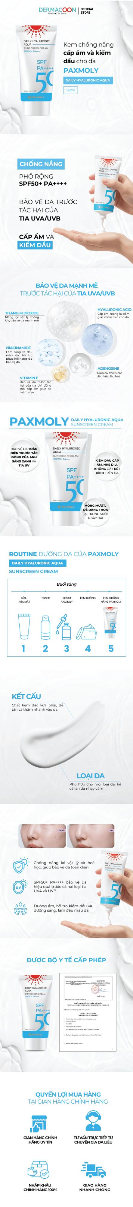 Kem chống nắng Daily Hyaluronic Aqua Sunscreen Cream Pax Moly chính là “chân ái” cho làn da dầu mụn với kết cấu mỏng nhẹ, ít nhờn rít và thẩm thấu nhanh. Đặc biệt là khả năng giúp kiềm dầu, bảo vệ các nốt mụn trước tác hại của ánh mặt trời và môi trường ô nhiễm, hỗ trợ giảm nguy cơ thâm sẹo do mụn. Công thức chống thấm nước ưu việt thích hợp sử dụng hàng ngày và cả những hoạt động ngoài trời.
