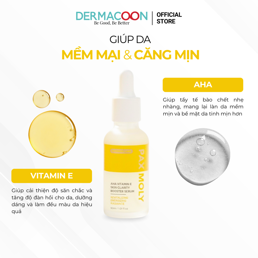Serum làm sáng và dưỡng ẩm PAXMOLY AHA Vitamin E Skin Clarity Booster là lựa chọn phù hợp cho làn da đang xỉn màu, thiếu sức sống hoặc cần một sản phẩm vừa hỗ trợ đều màu da vừa duy trì độ ẩm ổn định. Với kết cấu serum dễ thấm, sản phẩm giúp làn da trông tươi tắn và rạng rỡ hơn theo thời gian, đồng thời mang lại cảm giác mềm mại, mịn màng và dễ chịu sau khi sử dụng, đặc biệt phù hợp với da nhạy cảm hoặc da có dấu hiệu lão hóa sớm.