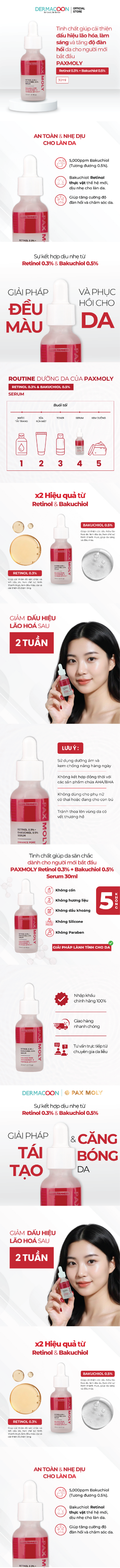 Tinh chất kết hợp Retinol 0.3% + Bakuchiol 0.5% hỗ trợ cải thiện nếp nhăn và cải thiện độ đàn hồi da. Ngoài ra, sản phẩm còn cải thiện kết cấu da, hỗ trợ cải thiện lỗ chân lông to, làm mờ thâm và đều màu da, tăng cường hàng rào bảo vệ da và hỗ trợ cải thiện tình trạng lão hóa da sớm.