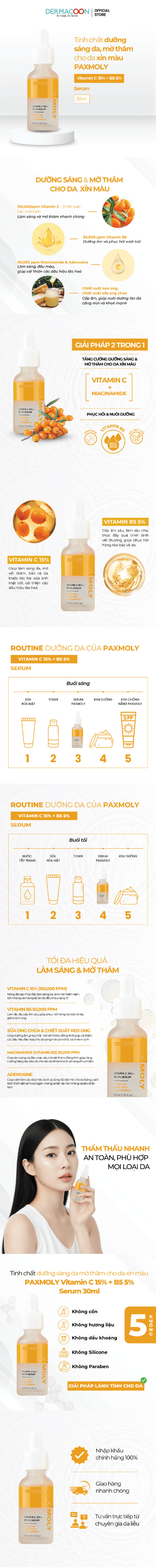 Tinh chất dưỡng da kết hợp Vitamin C 15% và B5 5% cải thiện sắc tố da, bảo vệ da, cấp ẩm và làm dịu da, cho làn da luôn mềm mịn, căng bóng.