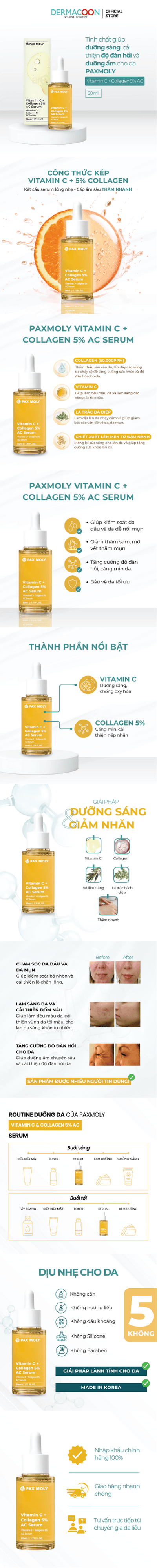 Tinh chất dưỡng da kết hợp Vitamin C + Collagen 5%, sản phẩm giúp da cải thiện độ đàn hồi và săn chắc da, cho làn da sáng mịn hơn và hỗ trợ làm mờ thâm nám. Góp phần bảo vệ da trước các tác nhân có hại của môi trường.