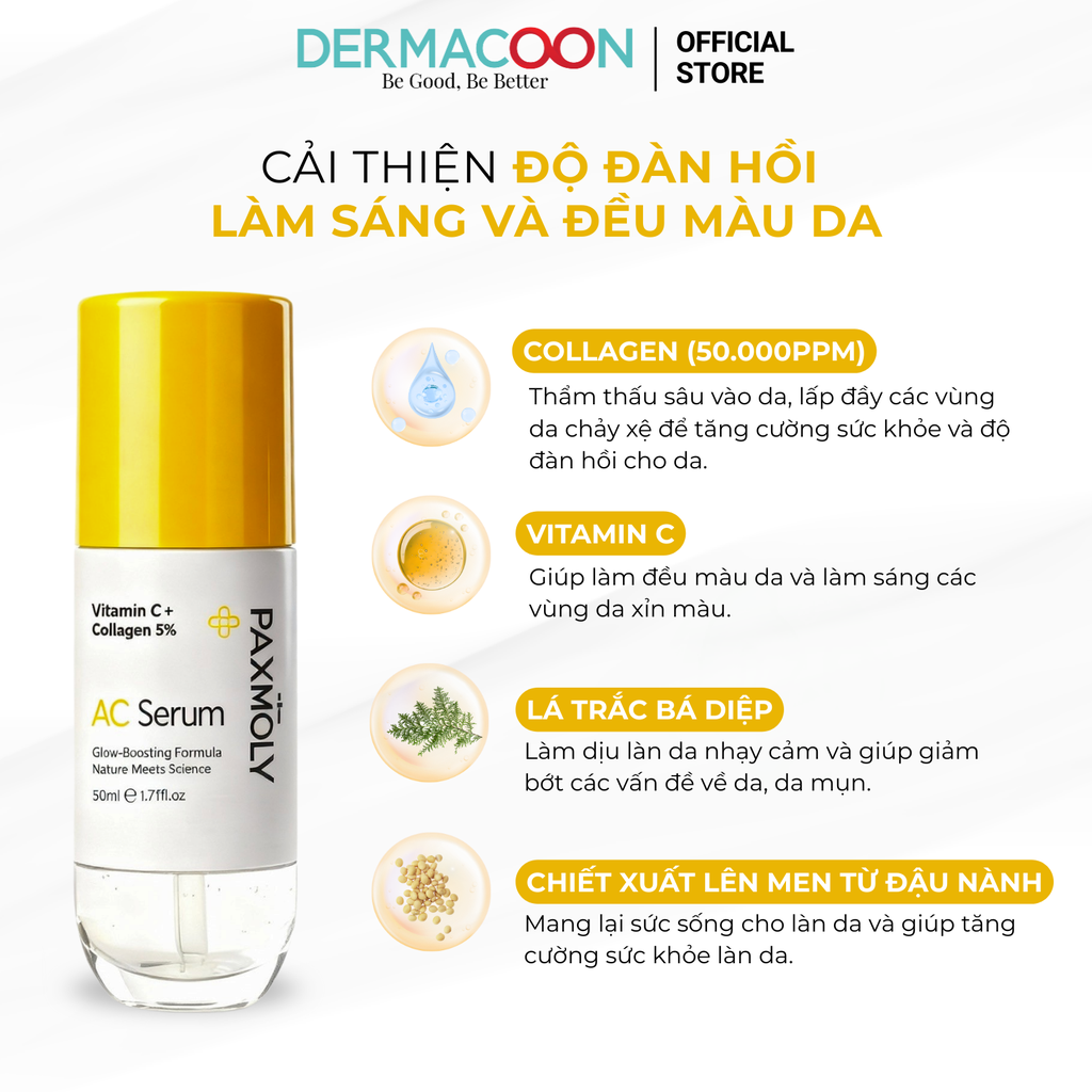 Tinh chất dưỡng da kết hợp Vitamin C + Collagen 5%, sản phẩm giúp da cải thiện độ đàn hồi và săn chắc da, cho làn da sáng mịn hơn và hỗ trợ làm mờ thâm nám. Góp phần bảo vệ da trước các tác nhân có hại của môi trường.
