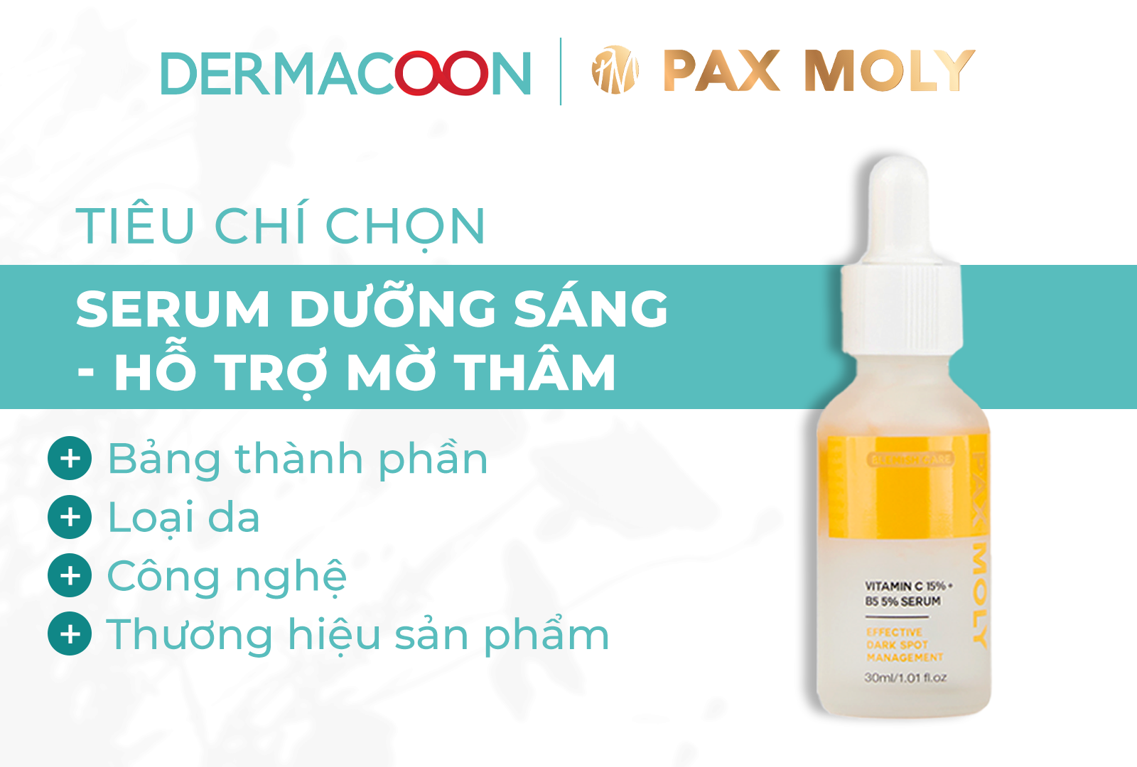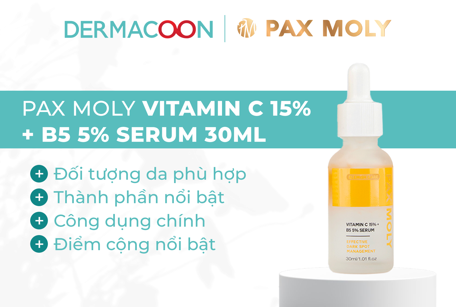 Trong danh sách top 5 serum dưỡng sáng – hỗ trợ mờ thâm được quan tâm hiện nay, PAX MOLY Vitamin C 15% + B5 5% Serum 30ml là lựa chọn phù hợp cho những làn da đang gặp tình trạng xỉn màu, kém rạng rỡ nhưng vẫn cần đảm bảo yếu tố dịu nhẹ khi sử dụng lâu dài.