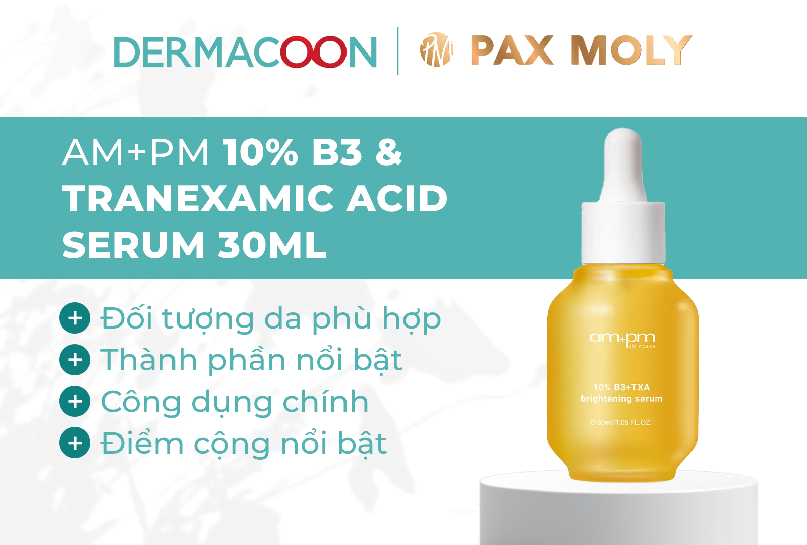 Trong nhóm top 5 serum dưỡng sáng da hỗ trợ cải thiện thâm sạm, AM+PM 10% B3 & Tranexamic Acid là lựa chọn phù hợp cho những làn da đang gặp tình trạng da yếu, xỉn màu và không đều màu nhưng vẫn cần một sản phẩm có thể sử dụng hằng ngày, an toàn và ổn định nền da lâu dài.