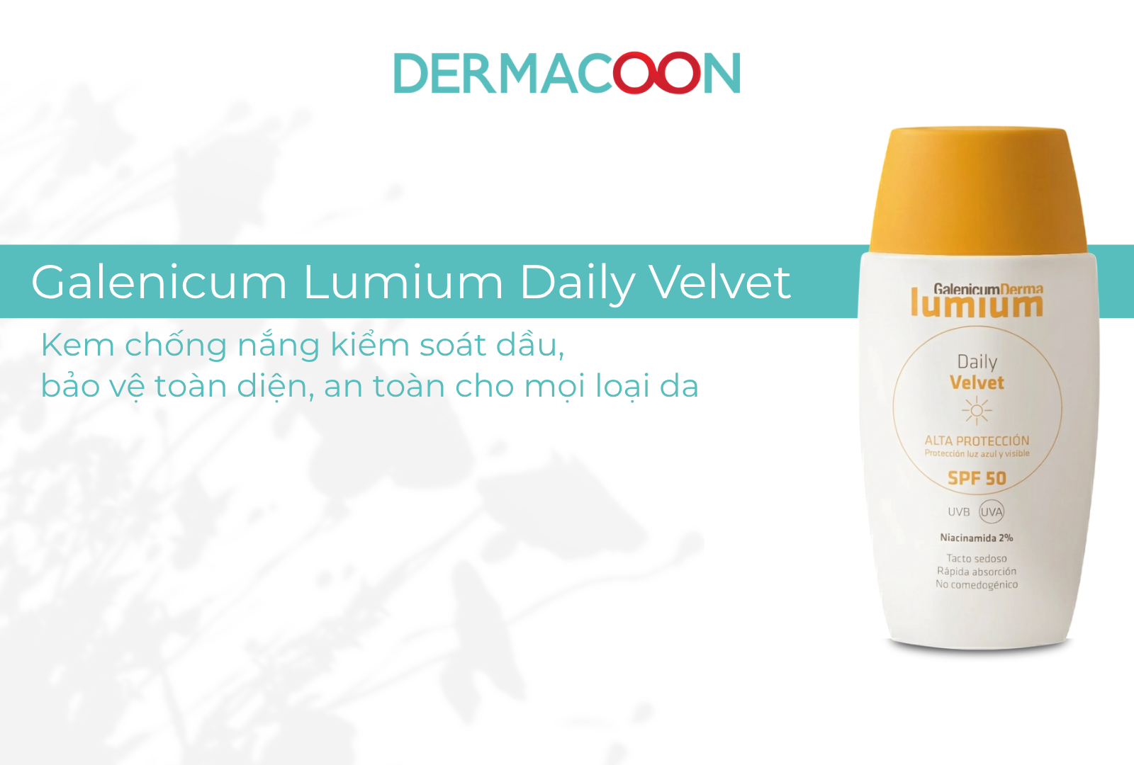 Nếu bạn đang tìm một kem chống nắng cho da dầu mụn vừa bảo vệ da tốt vừa không gây bí bách, Galenicum Lumium Daily Velvet SPF50 là lựa chọn đáng cân nhắc nhờ kết cấu velvet mỏng nhẹ và khả năng kiểm soát dầu hiệu quả.
